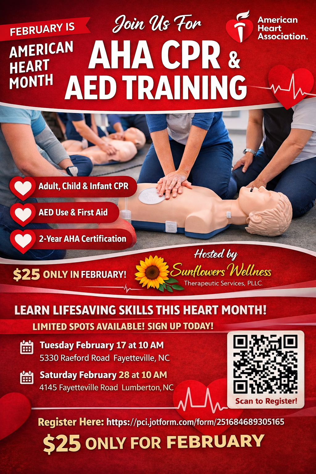 Join us for an in-person CPR class hosted by Sunflowers Wellness LLC. Learn life-saving techniques and get certified through the American Heart Association for 2 years. Don't miss this opportunity to gain valuable skills and knowledge to help others in emergencies. In the CPR Course, you will be trained in Basic Life Skills and AED. Once you complete the class, you will be certified for 2 years with the American Heart Association.